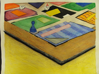 5) I loved this game board drawing. I got to draw my favorite game and played it afterwards, it was one of the funnest projects. It shows my personality because i used very many bright and bubbly colors. I used lots of value and blended everything. It took time and patience but it wasnt very hard. I enjoed working on this because i enjoy drawing and coloring. I would do this agian if i could.